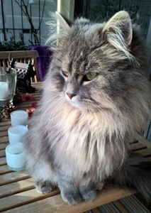 Kater PAUL ist eine Norwegischer Waldkatze und 5 Jahre alt. Er hat ein langes schwarz-graues Fell mit weißer Brust, weißer Schnauze und Nasenrücken sowie weiße Pfoten und Schnurrhaare. Auffallend ist ein dunkler Fleck am Kinn. PAUL ist Freigänger und Fremden gegenüber sehr scheu.
