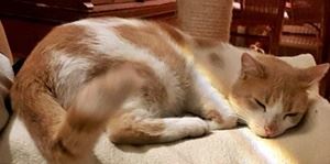 Kater TEDDY ist 2 Jahre alt. Sein Fell hat eine weiße Grundfarbe mit beigen Stellen. Er hat einen rötlich-beige getigerten Schwanz und blaue Augen. TEDDY ist Freigänger und fremden Personen gegenüber eher zutraulich.