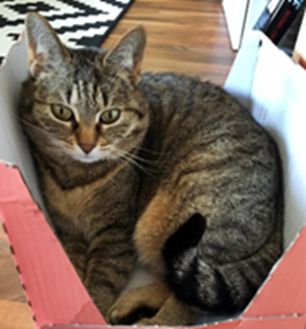 Kater SQUEAKY ist 9 Jahre alt. Er hat ein schwarz getigertes Fell mit weißen Schnurrhaaren, weißen Pfoten und einem weißen Hals/Brustfleck. SQUEAKY ist Freigänger und Fremden gegenüber schüchtern und scheu.