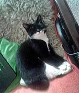 Kater FINDUS ist 2 Jahre alt. Sein Fell ist schwarz mit nur vereinzelten weißen Haaren auf der Brust und am Rücken. FINDUS ist Freigänger. Er ist sehr zutraulich und "spricht" sehr viel.
