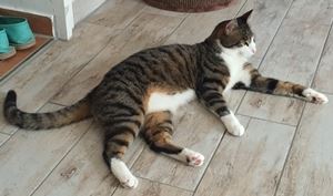Kater BALU ist 4,5 Jahre alt. Er hat ein schwarz-braun getigertes Fell mit weißer Brust und Bauch sowie weißen Pfoten. Er ist Freigänger und sehr zutraulich.