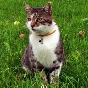 Kater SCHORSCH ist 7 Monate alt. Er hat ein grau-braun-schwarz gestromtes Fell mit weißer Schnauze und weißem Latz. Er ist Freigänger und Fremden gegenüber zutraulich. Er geht gerne in fremde Wohnungen, Garagen, etc.