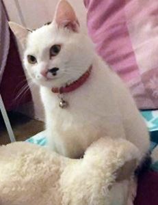 Kater BABY ist ca. 2 Jahre alt. Er hat ein weißes Fell mit dunklen Stellen am Rücken, einen schwarzen Schwanz und weiße Pfoten. Auffällig ist ein schwarzer kleiner Fleck an seiner linken Nasenseite. BABY ist ein reiner Wohnungskater und durch ein gekipptes Badfenster entwischt. Er ist Fremden gegenüber eher schüchtern. Baby trägt ein rotes Halsband mit Glöckchen und rosa Adreßkapsel.
