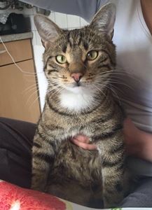 Kater TONI ist 1,5 Jahre alt. Er hat ein braun getigertes Fell mit weißem Kinn. TONI ist Freigänger und auch Fremden gegenüber relativ zutraulich.