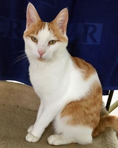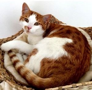 Kater CASPER ist 1 Jahr alt. Er hat ein rot-weißes Fell mit weißen Pfoten. CASPER ist Freigänger und Fremden gegenüber scheu.