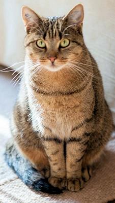 MINNI ist 5 Jahre alt. Ihr Fell ist braun getigert mit weißem Brustfleck. Sie ist Freigängerin und Fremden gegenüber schüchtern.
