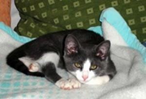 Kater GISMO ist 11 Jahre alt. Er ist recht kräftig. Sein Fell ist schwarz/weiß gemustert. GISMO ist sehr zutraulich. Er trägt ein schwarzes Zeckenband.
