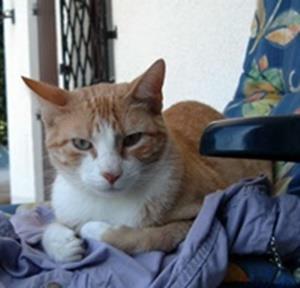 Kater ORBI ist 2 Jahre alt. Sein Fell ist hauptsächlich weiß mit vereinzelten roten Flecken am Rücken und am Ohr. Sein Schwanz ist komplett rot getigert. GORBI ist Fremden gegenüber sehr zutraulich.