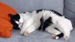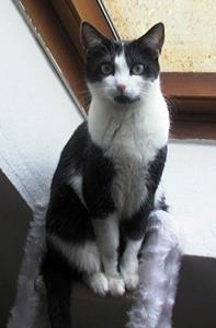 Kater MAX ist 4 Jahre alt. Er ist schwarz-weiß, mit schwarzem Rücken, weißem Bauch mit schwarzen Flecken sowie weiße Pfoten. Sein Schwanz ist schwarz mit einer weißen Schwanzspitze.