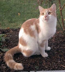 Kater LUKAS ist 1 Jahr alt. Er ist rot getigert, sein Bauch und die Pfoten sind weiß. LUKAS trug bei seinem Verschwinden ein hellgrün-schwarzes Halsband.