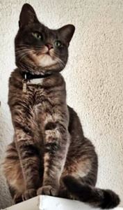 LILLY ist 8 Jahre alt. Sie hat ein braun-grau getigertes Fell mit weißem Schnauzen/Kinnbereich. LILLY ist Freigängerin und fremden Personen gegenüber eher scheu.
