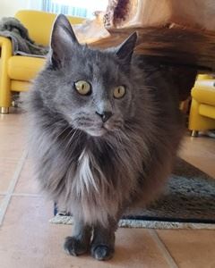 CHARLY ist ein 10 Jahre alter dunkelgrauer Angorakater mit langem Fell. Er hat einen weißen Brustfleck und grüne Augen. CHARLY ist Freigänger und fremden Personen gegenüber sehr scheu.