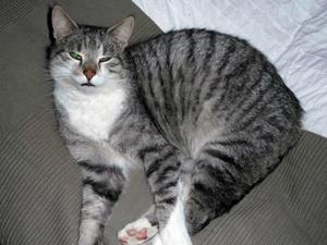 Kater IGOR ist 1 Jahr alt und noch ziemlich klein. Er ist grau getigert mit weißem Bauch und markanter Gesichtszeichnung. IGOR ist Freigänger.