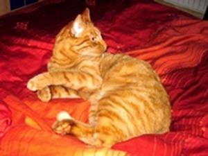 Kater TOULOUSE ist ca. 1 1/2 Jahre alt. Er ist dunkelrot getigert mit einem weißen Fleck zwischen den Hinterbeinen. TOULOUSE ist Freigänger und Fremden gegenüber eher scheu.