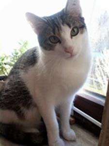 Kater GISMO ist 11 Jahre alt. Er ist recht kräftig. Sein Fell ist schwarz/weiß gemustert. GISMO ist sehr zutraulich. Er trägt ein schwarzes Zeckenband.