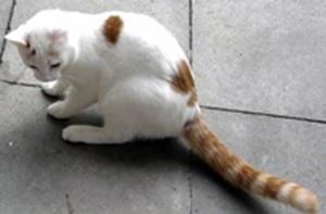 Kater ORBI ist 2 Jahre alt. Sein Fell ist hauptsächlich weiß mit vereinzelten roten Flecken am Rücken und am Ohr. Sein Schwanz ist komplett rot getigert. GORBI ist Fremden gegenüber sehr zutraulich.