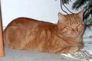 Kater PANTHER ist ca. 2 Jahre alt. Er ist rot-getigert mit einem kleinen weißen Fleck an der Kehle.