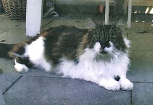TONTOS ist 9 Jahre alt. Sie ist eine Langhaarkatze in den Farben schwarz, braun und viel weiss. Gesicht, Brust, Bauch, Beine und Pfoten sind komplett weiß, ihr Schwanz ist dunkel und buschig.