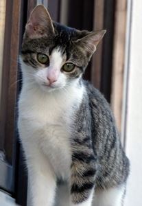 Kätzin SEPPI ist erst 8 Monate alt. Sie hat ein braun-schwarz gerädertes Fell, eine hellere Schnauze/Kinnbereich, eine weiße Brust sowie weiße Pfoten. SEPPI ist Freigängerin und Fremden gegenüber eher scheu.
