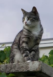 Kater JUNKEY ist 10 Jahre alt. JUNKEY hat ein grau-schwarz gestromtes Fell mit weißem Kinn, Brust- und Bauchbereich sowie weißen Pfoten. Sein Nasenrücken ist dunkel. JUNKEY ist Freigänger und auch Fremden gegenüber zutraulich.