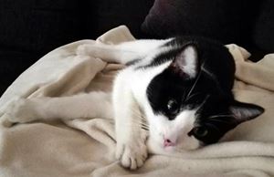 Kater MILO ist 1,5 Jahre alt. Er hat ein schwarz-weißes Fell mit weißen Pfoten sowie einem kleinen schwarzen Fleck auf der Nasenspitze. MILO ist Freigänger und Fremden gegenüber sehr zutraulich.