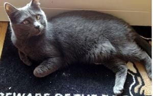 Kater TOMMI ist 9 Jahre alt. Sein Fell ist komplett grau mit einem kleinen weißen Brustfleck. Er hat leicht bläulich schimmernde Augen und ist etwas schwerhörig. TOMMI ist Freigänger und Fremden gegenüber eher zutraulich.