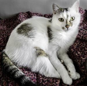 Kater BUDDIE ist 2 Jahre alt. Seine Fellgrundfarbe ist weiß mit grau gefleckten Stellen. Sein Schwanz ist dunkel (getigert) und er hat eine markante Gesichtszeichnung. BUDDIE ist Freigänger und neugierig, er ist Fremden gegenüber zutraulich.