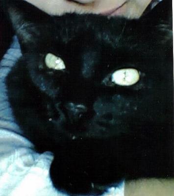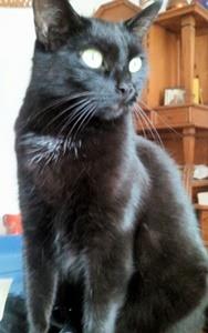 SELLISCH ist 9 Jahre alt. Ihr Fell ist schwarz mit einem kleinen weißen Brustfleck und einem weißen Bauch. Sie hat grün-gelbe tropfenförmige Augen. SELLISCH ist eine reine Wohnungskatze und sehr scheu.
