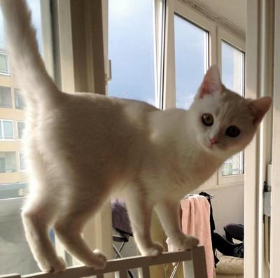 MIETZI ist 1,5 Jahre alt und eine Karthäuserkatze. Ihr Fell ist komplett weiß mit rosa Pfoten und Schnauze. MIETZI ist eine reine Wohnungskatze.