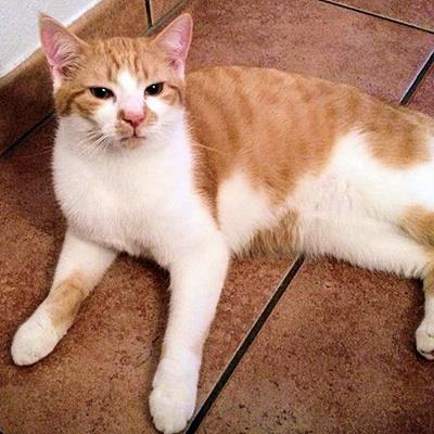 Kater PABLO ist 1 Jahr alt. Sein Fell ist rot getigert mit weiß (Bauch cremeweiss, rot-getigerter Rücken, wellige Zeichnung seitlich, getigerter Schwanz sowie eine markante Zeichnung um die Schnauze, wie ein Bart). Er hat auffällig schöne große bernsteinfarbene Augen. PABLO ist seit April 2013 Freigänger. Er ist Fremden gegenüber eher scheu. Er läßt sich evtl. mit Trockenfutter (Whiskas) locken.