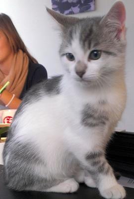 Kater PASCHE ist erst 10 Wochen alt. Sein Fell ist weiß mit grau getigerten Flecken und grauem Fleck auf der Nase. PASCHE war 2 Wochen in der Wohnung und vorher auf einem Bauernhof zuhause. Er ist Fremden gegenüber zunächst scheu, dann interessiert.