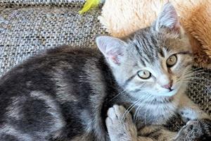 KASPER ist ca. 1 Jahr alt. Er hat ein grau getigertes Fell. Sein linkes Auge ist leicht verletzt (Narbe). KASPER ist Freigänger und Fremden gegenüber eher scheu.
