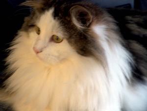 Kater SUNNY ist ca. 3 Jahre alt. Er ist ein Angorakater mit Einschlag norwegische Waldkatze. Er hat ein langes graues Fell und grüne Augen. SUNNY ist äußerst scheu.