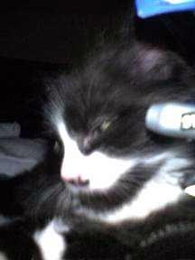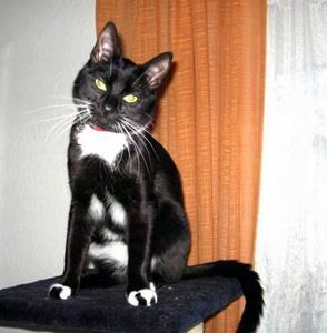 Kater NEO ist 1 Jahr und 4 Monate alt. Er ist ein Mischling zwischen Perser/Maine Coon und Hauskatze. Er hat ein schwarzes, etwas längeres Fell. Im Hals- und Bauchbereich ist er weiß. Die Pfoten sind ebenfalls weiß. Im Schnauzbereich hat er auf der linken Seite einen schwarzen halben "Schnauzer". Er trägt ein schwarzes Zeckenhalsband.