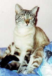 Kater TIMON ist 1 Jahr alt und eher klein und zierlich. Er ist hellbraun/schwarz gestromt mit weißem Bauch, weißer Schwanzspitze und weißen Pfoten. Die linke Vorderpfote ist bis zur Schulter weiß. Die Stromung bildet Kreise auf den Flanken und einen langen Strich auf dem Rücken. Er hat grüne Augen. TIMON ist Freigänger. Er ist sehr lieb und zutraulich.