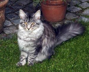 KIARA ist 10 Monate alt und schon ziemlich groß. Sie ist eine Maine Coon Katze mit buschigem Schwanz, Fellfarbe grau-schwarz tabby. Sie hat bernsteinfarbene, schwarz umrandete Augen. Sie hat besonders lange Barthaare und buschelige Haare in den Ohren. KIARA ist sehr scheu.