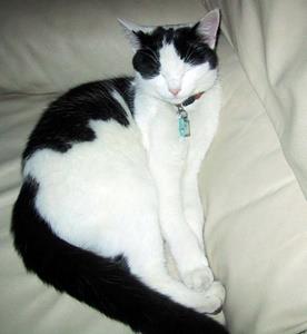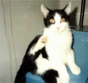 Kater CHARLY ist 7 Jahre alt. Er hat ein weißes Fell mit markanter schwarzer Zeichnung und schwarzen Flecken. Er hat vier weiße Pfoten und einen schwarzen Schwanz. CHARLY ist ein reiner Wohnungskater.