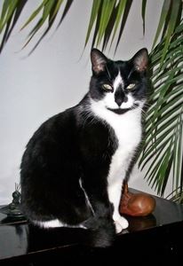 Kater FELIX ist ca. 1 Jahr alt. Er hat ein schwarz-weißes Fell mit weißen Pfoten und schwarzem Schwanz. Erkennungszeichen sind ein schwarzer Fleck auf der Nasenspitze und sein schwarz umrandetes linkes Auge. FELIX ist Freigänger und Fremden gegenüber eher scheu, ist aber sehr neugierig.
