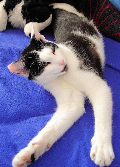 SAMMY ist 3,5 Jahre alt. Er hat ein schwarz-weißes Fell. Sein Bauch und Kinn sind überwiegend weiß, bis auf einen schwarzen Fleck am Kinn. Sein Näschen ist rosa, auch die Ohren größtenteils. Die Pfötchen sind rosa mit schwarzen Flecken. Er ist groß und schlank. SAMMY ist Freigänger und hört auf seinen Namen. Er ist zutraulich, frech und faucht schnell.