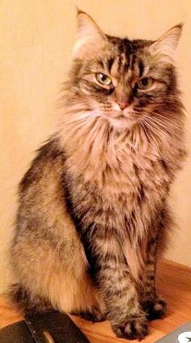 TAMINO ist 7 Jahre alt. Er ist ein Maine Coon-Kater mit langem grau getigerten Fell. Er hat eine weiße Pfote. Er ist Freigängerin und Fremden gegenüber sehr scheu.