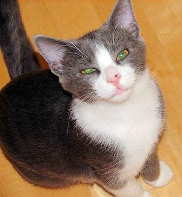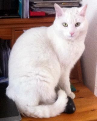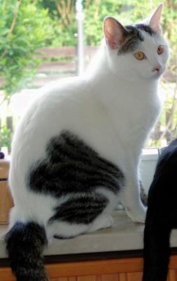 Kater SWEETIE ist ca. 2 Jahre alt. Sein Fell ist weiß mit grauen Flecken (Kopf, Seiten). Er hat einen dunkel getigerten Schwanz und gelbe Augen. SWEETIE ist Freigänger. Er ist ziemlich ängstlich gegenüber fremden Katzen.