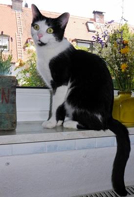 PHILI ist 2 Jahre alt, klein und zierlich. Ihre Fellgrundfarbe ist schwarz mit weißem Bauch,weißer Brust, weißen Pfoten und Schnauze. Sie hat eine markante Gesichtszeichnung und gelb-grüne Augen. PHILI ist Freigängerin und sehr zutraulich.