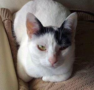 LUCKY ist 4 Jahre alt. Sie hat ein weißes Fell mit schwarzer Zeichnung über Stirn und Ohren sowie einen schwarzen Schwanz. LUCKY ist Freigängerin und extrem zutraulich.