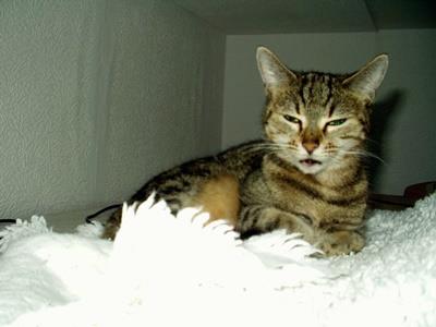 Am 22. Oktober 2003 wurde eine ältere grau getigerte Katze (vermutlich Perserkatze) verletzt unter einem Auto gefunden. Sie hat fast keine Zähne mehr und eine ältere Verletzung an der rechten Vorderpfote.