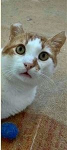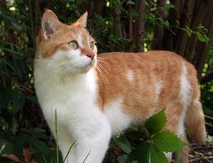 Kater CASPER ist 1 Jahr alt. Er hat ein rot-weißes Fell mit weißen Pfoten. CASPER ist Freigänger und Fremden gegenüber scheu.