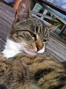 Kater BALU ist 4,5 Jahre alt. Er hat ein schwarz-braun getigertes Fell mit weißer Brust und Bauch sowie weißen Pfoten. Er ist Freigänger und sehr zutraulich.