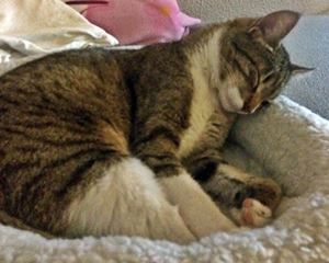 ENNI ist 12 Jahre alt. Sie hat ein braun getigertes Fell mit weißer Schnauze. Erkennungszeichen ist eine gut sichtbare Einkerbung in der rechten Ohrspitze. ENNI ist Freigängerin und Fremden gegenüber sehr zutraulich.