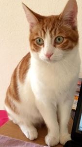 Kater SIMBA ist ca. 1 Jahr alt. Er hat ein rot-weißes Fell. Sein Nasenrücken ist halb weiß, halb rot. Er hat hellbraun-gelbe Augen. SIMBA ist Freigänger.