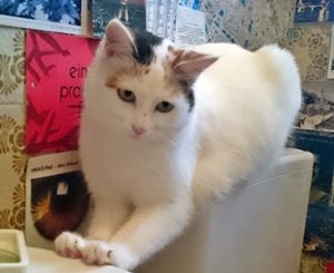 SPOT ist ca. 2,5 Jahre alt und klein. Sie hat eine weiße Fellgrundfarbe mit dreifarbigen Flecken an den Ohren und Hinterkopf sowie einem mehrfarbigen Schwanz mit weißer Schwanzspitze. SPOT ist Freigängerin und Fremden gegenüber sehr zutraulich. Möglicherweise ist sie in einem Auto mitgefahren.