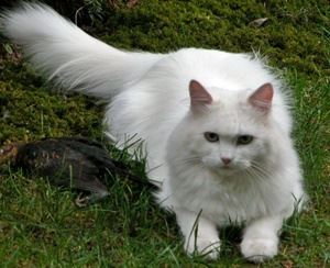 FELI ist 6 Jahre alt und taub. Sie hat ein schneeweißes längeres Fell und einen buschigem Schwanz. Sie ist Freigängerin.